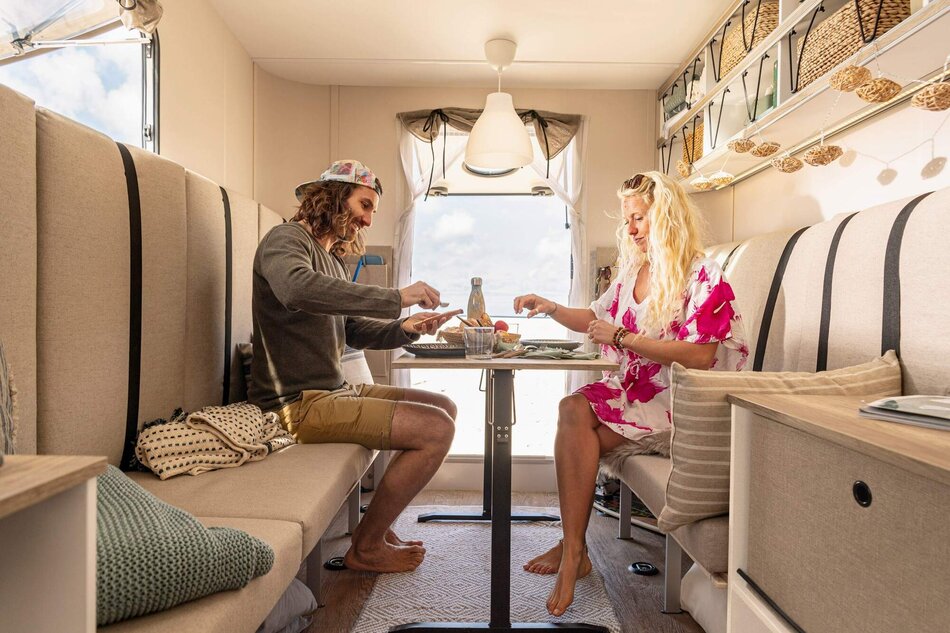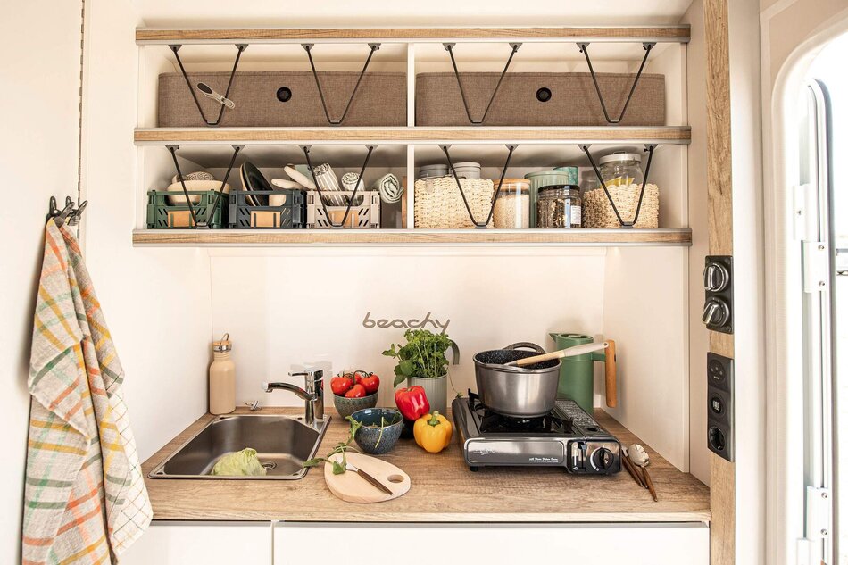 Binnen en buiten zijn er geen tegenstellingen bij je BEACHY. Natuurlijke materialen en stoffen zorgen voor het strandgevoel. En met een paar simpele stappen verplaatst je de eet- en zithoek naar buiten, voor je eigen deur. Veel opbergruimte, gezellige slaapplekken en een praktische keuken horen natuurlijk ook bij het feest.