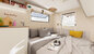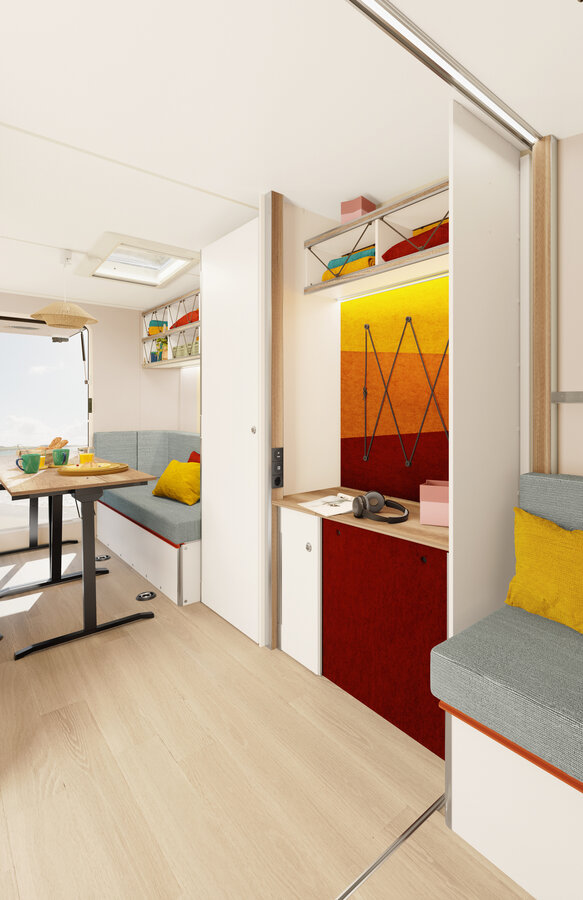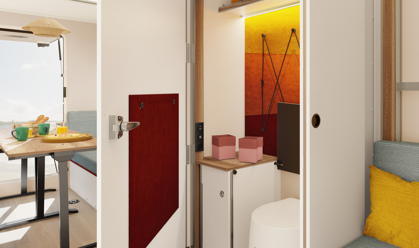 Uitgekiende oplossingen zorgen voor meer ruimte, bijv. Voor een mobiel toilet. In een handomdraai maak je met de optionele, vouwbare multifunctionele wand een ruim ‘klein kamertje’. Een grote kleerkast en talrijke vakken bieden voldoende opbergruimte.