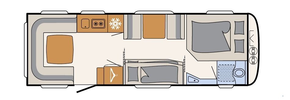 Deze caravan is ontworpen om de grootste gezinnen moeiteloos te herbergen, met maar liefst 7 zit- en slaapplaatsen en een doordachte indeling die privacy creëert: