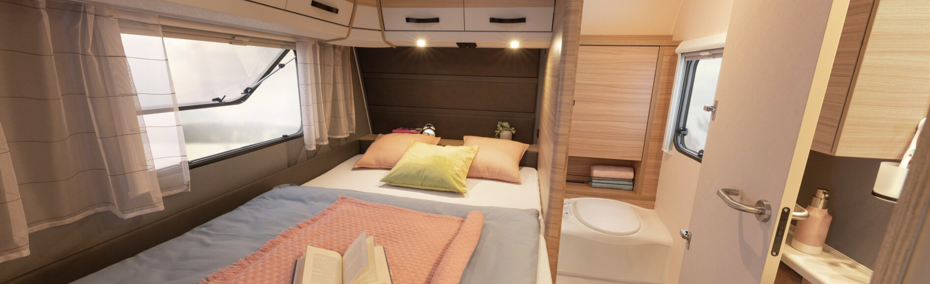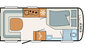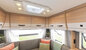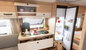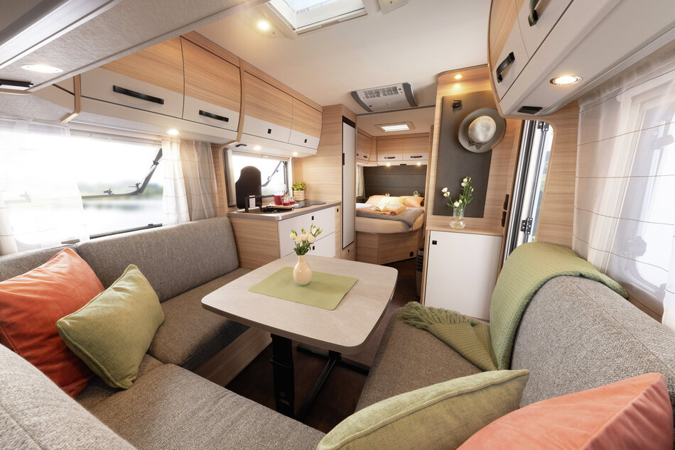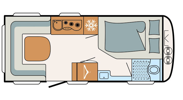 Deze indeling (Frans bed voor, keuken en sanitair in het midden, rondzit achter) staat bekend als de perfecte mix tussen een ruime leefruimte en een comfortabel slaapgedeelte.