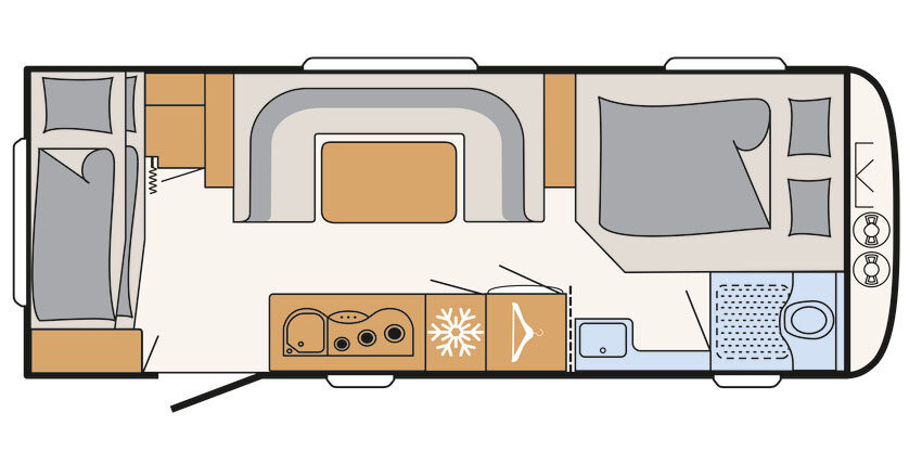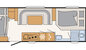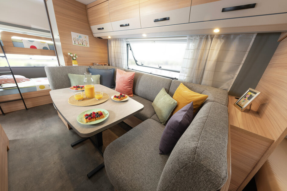 De Familie Lounge (Midden): De ruime rondzit vormt het hart van de caravan. Perfect voor gezamenlijke maaltijden, gezellige spelletjesavonden of gewoon lekker ontspannen. Deze zitgroep is bovendien om te bouwen tot een extra slaapplaats.