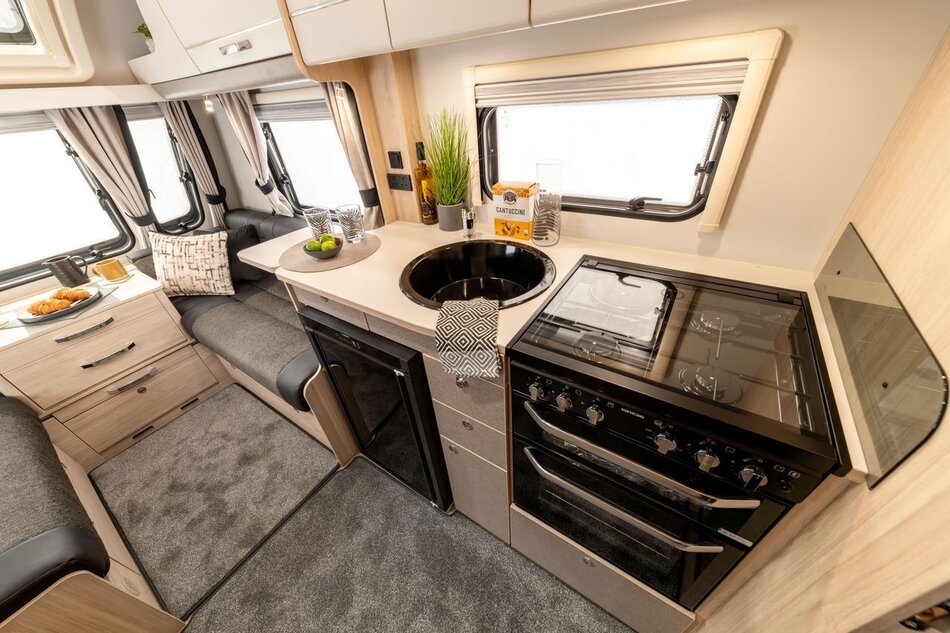 De keuken in de Apex 550 is een droom voor elke kookliefhebber. Geen behelpen op een klein pitje, maar een zeer luxe keuken voorzien van: