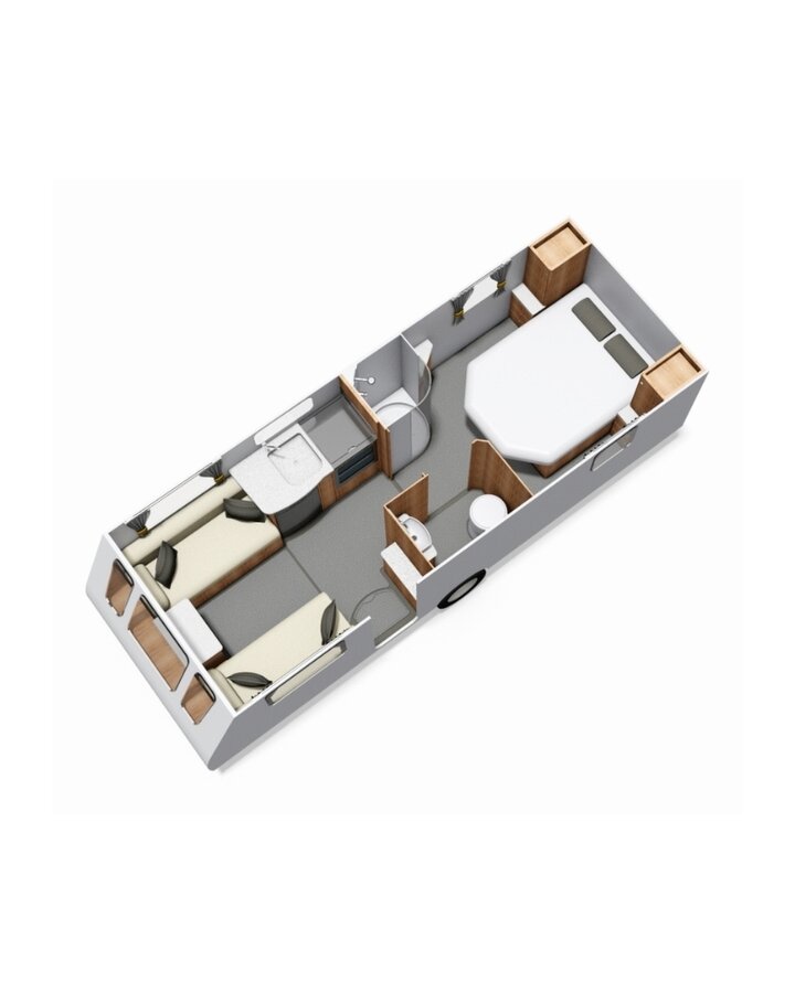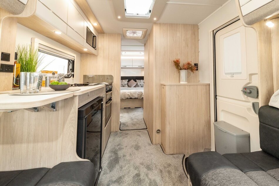 Voorin de caravan vindt u de royale, lichte dinette. Dankzij de grote ramen rondom en het panoramadak geniet u hier van een prachtig uitzicht. Het is de ideale plek voor een uitgebreid diner met vier personen of een ontspannen avond. Heeft u logees? In een handomdraai bouwt u deze zithoek om tot een volwaardig extra tweepersoonsbed.