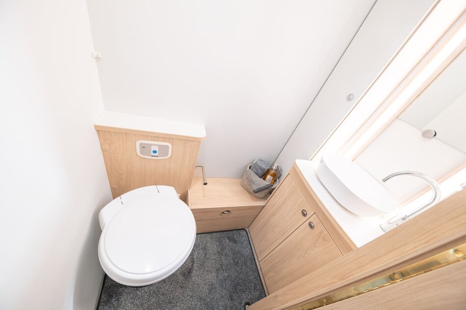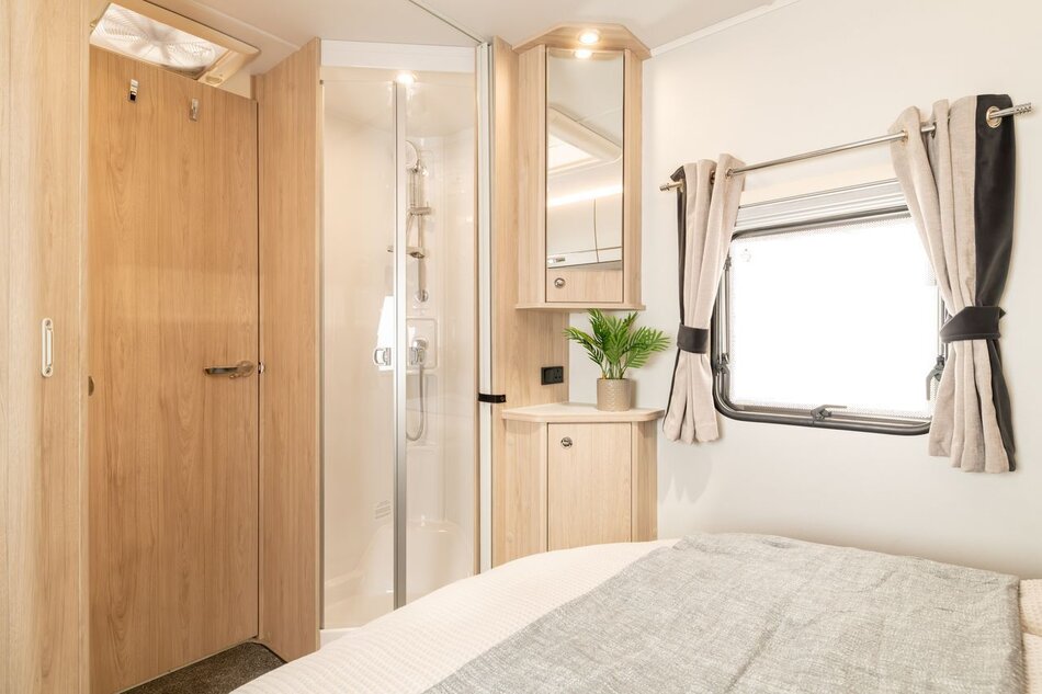 De badkamer in deze Elddis is werkelijk een klasse apart. Vergeet krappe ruimtes; hier geniet u van: