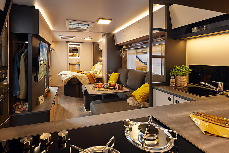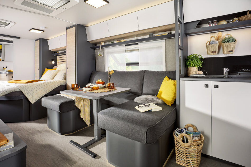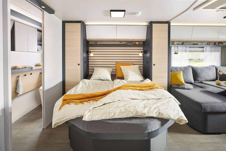 Groot, groter, gigantisch: met tot wel 20 m² is de MAXIA net een vakantieappartement op wielen. Eenpersoonsbedden of vrijstaand queensbed: in deze luxe caravan blijft geen wens onvervuld. Royale wasruimten en qua kleur op elkaar afgestemde woon- en slaapgedeelten maken de premiumcaravan perfect.