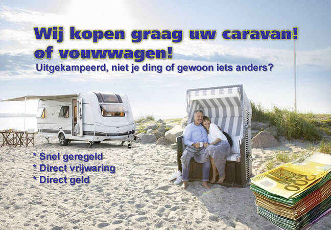 De Vries Caravans is continu op zoek naar jonge gebruikte caravans en vouwwagens. Vul daarom (geheel vrijblijvend) ons inkoopformulier in, dan zullen wij zo snel mogelijk contact met u opnemen! Vrijwaring en betaling direct geregeld!