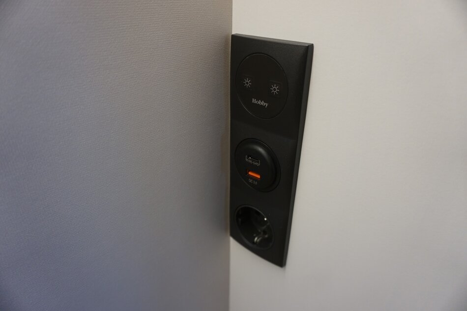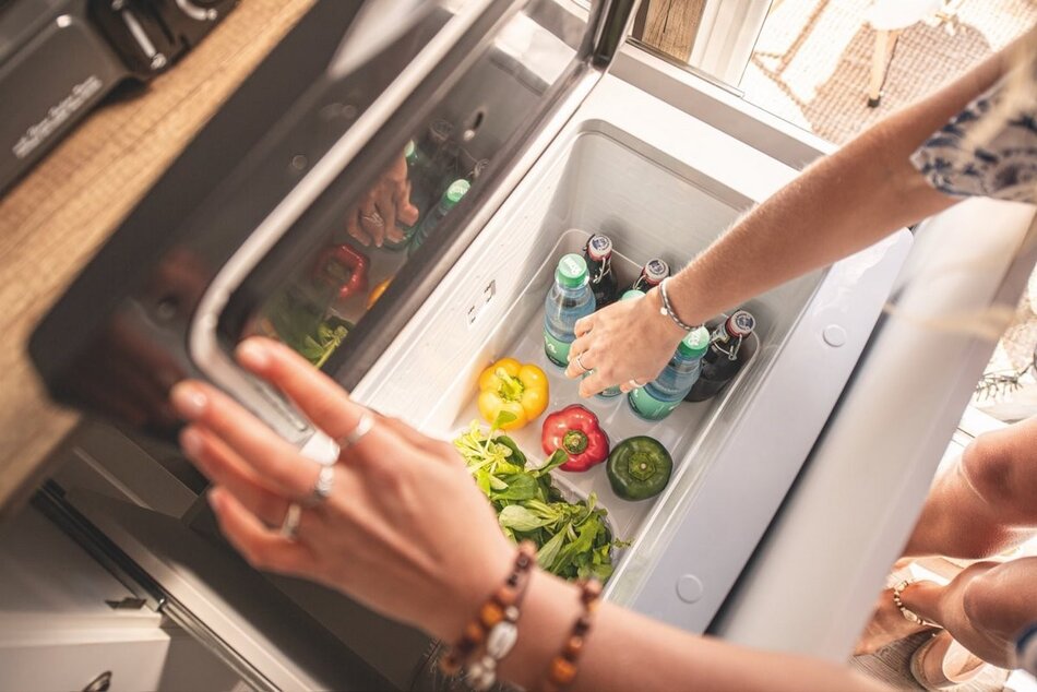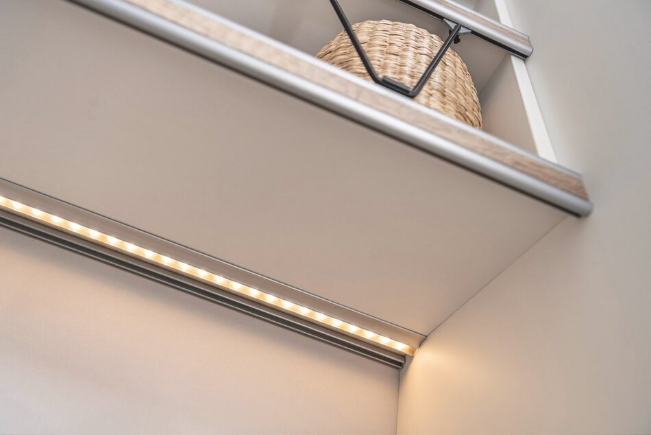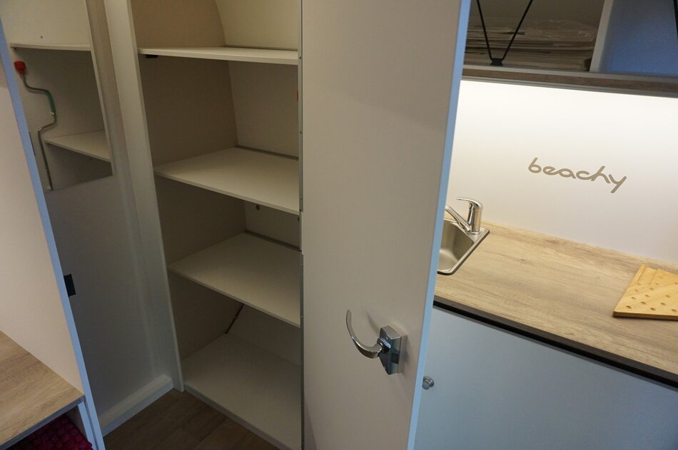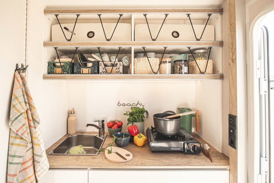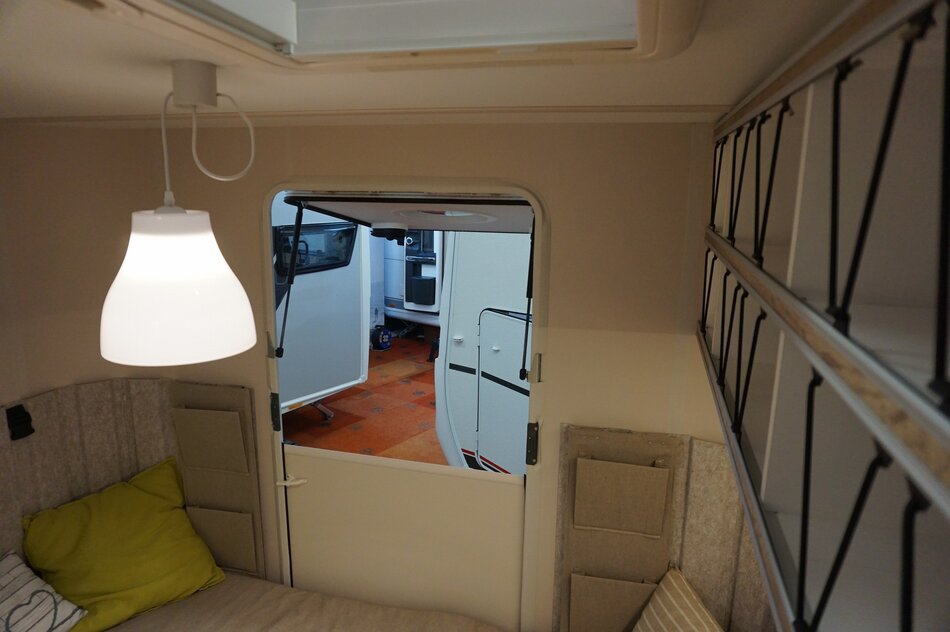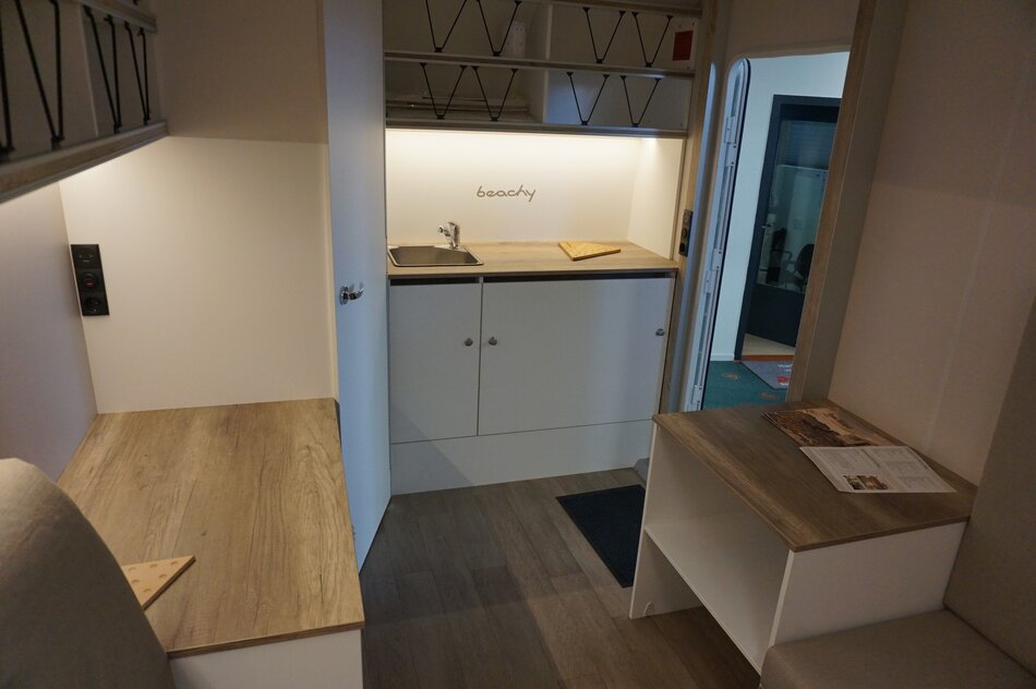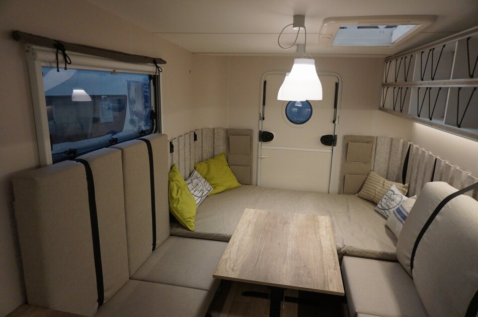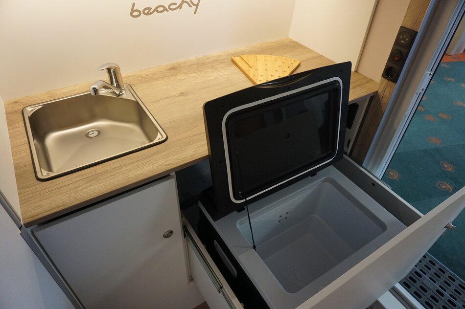 Veel kastruimte, Keukenhoek met grote lade en Compressor koelkist. Prachtige sfeerverlichting. Groot dakluik en openslaande achterdeur. Basisprijs € 19.200.-.