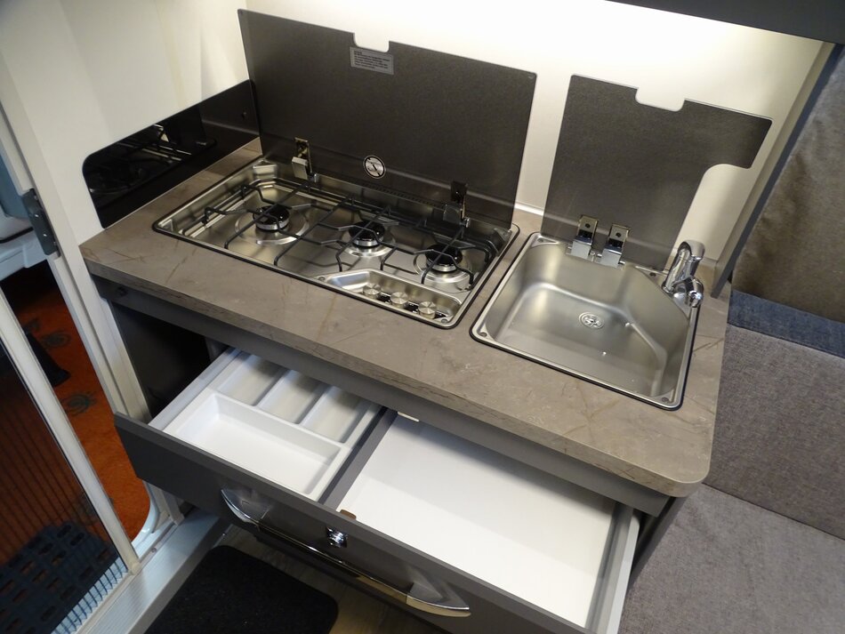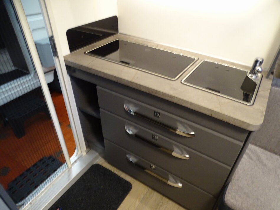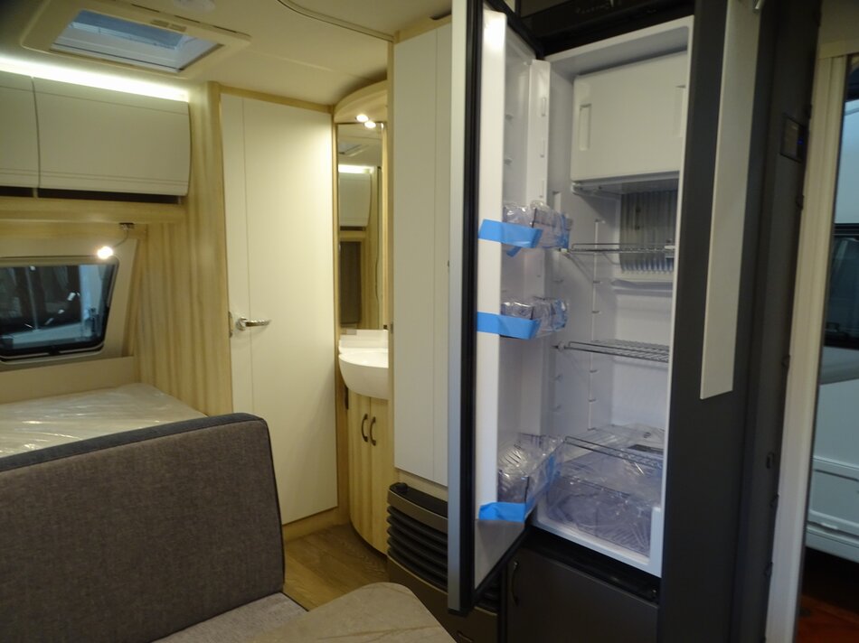 Ruime keuken met grote lades, dubbelzijdige koelkast 133ltr. Optie: Indirecte verlichting, tapijtset. Prijs rijklaar 28.355.-.