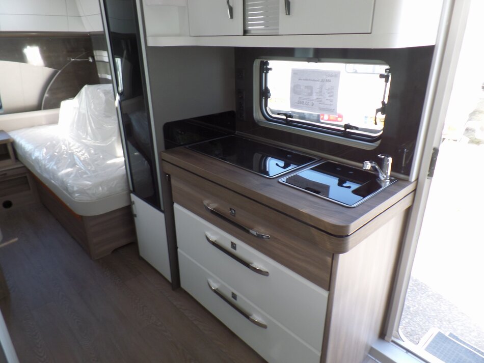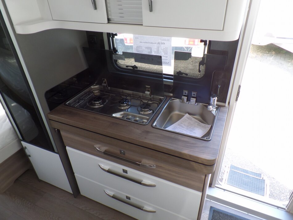 Deze Hobby Excellent 495 UL is uitgevoerd met de volgende opties: Reservewiel en beugel, Aslastverhoging 1750 kg ipv 1550 kg, Vloerverwarming en Bedverbreding. Prijs incl. opties € 33.840.-. Verbouwings actie € 30.950.-.