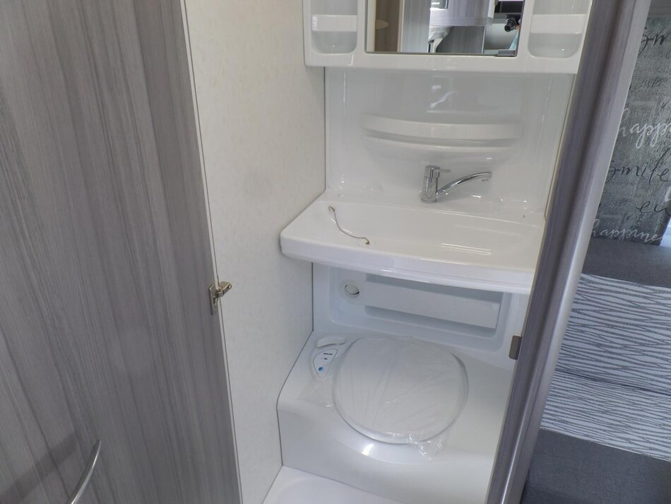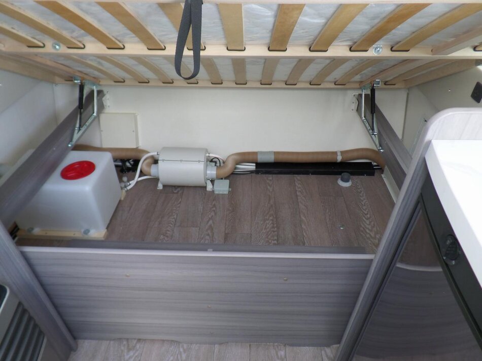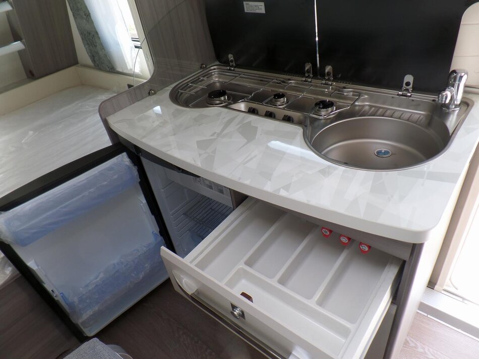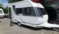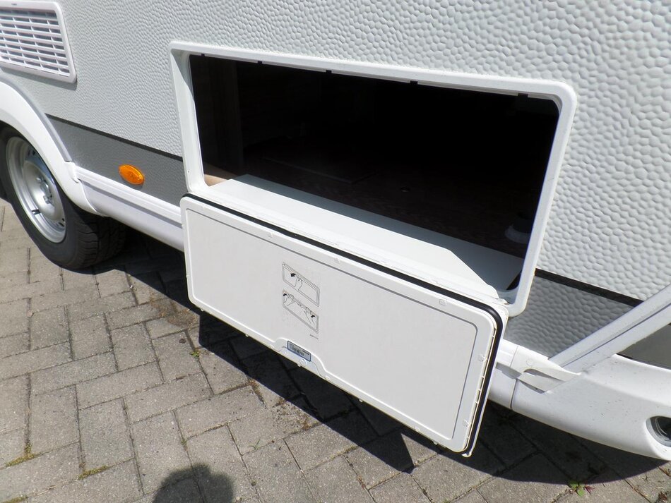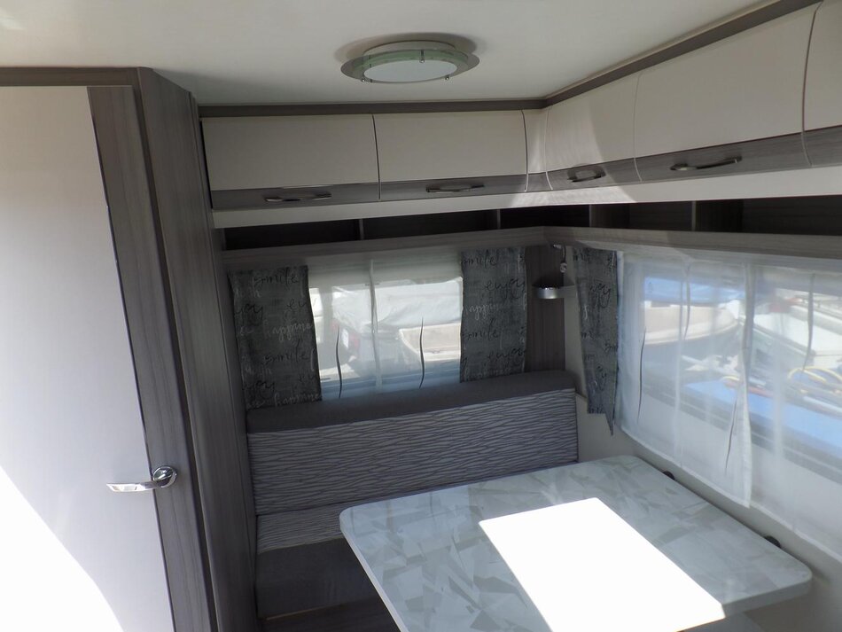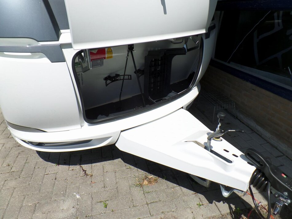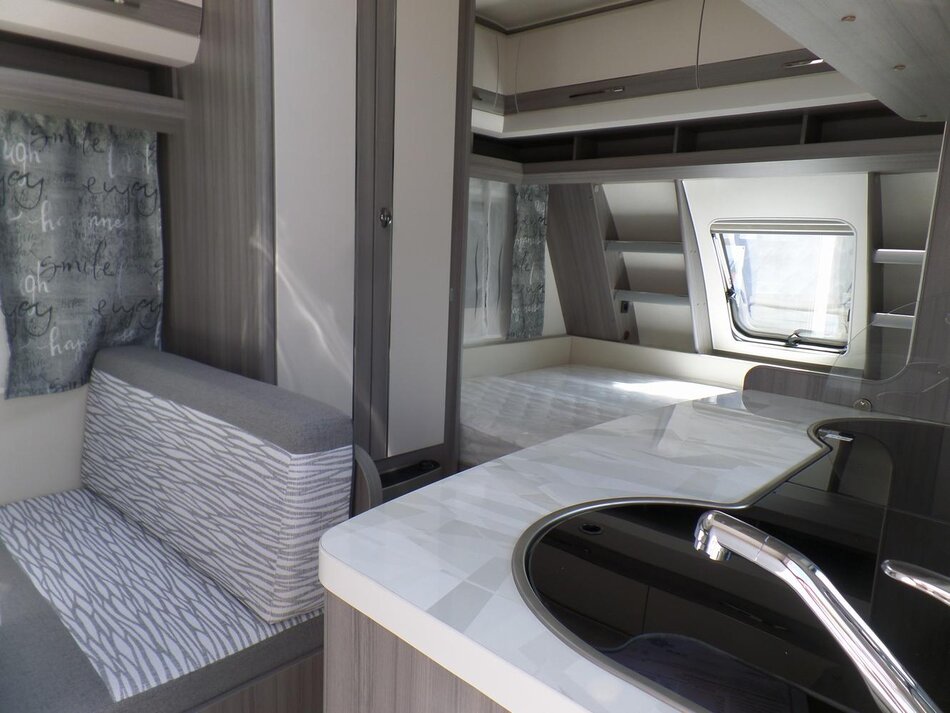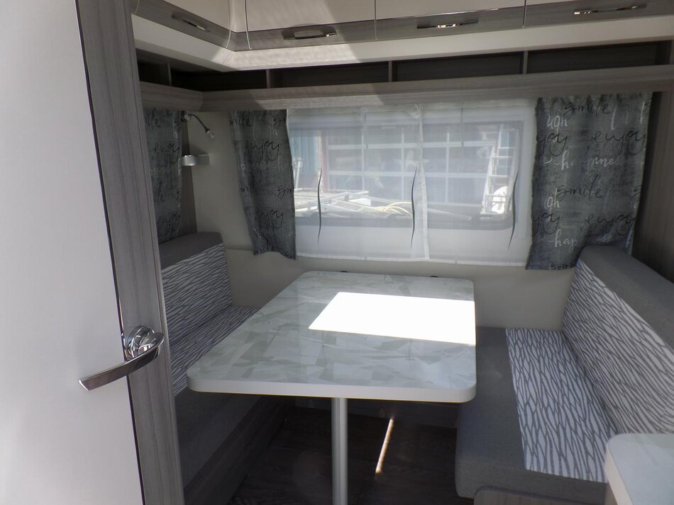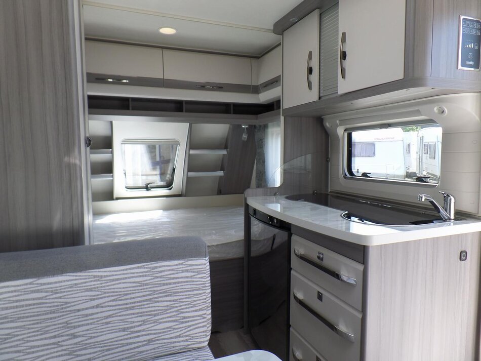 Nieuwe Hobby On Tour 390 SF 2019. Handelbare lichtgwicht caravan met comfortabel bed aan de voorzijde en een ruime treinzit aan de achterzijde. Keuken met veel berg en aflegruimte. Voortent, Fietsendrager achter.