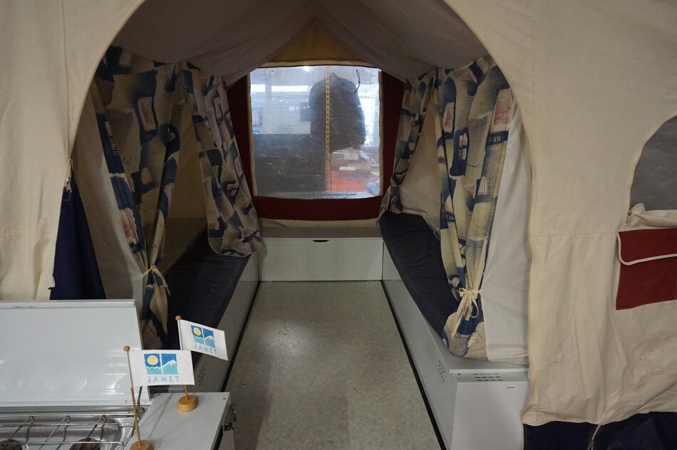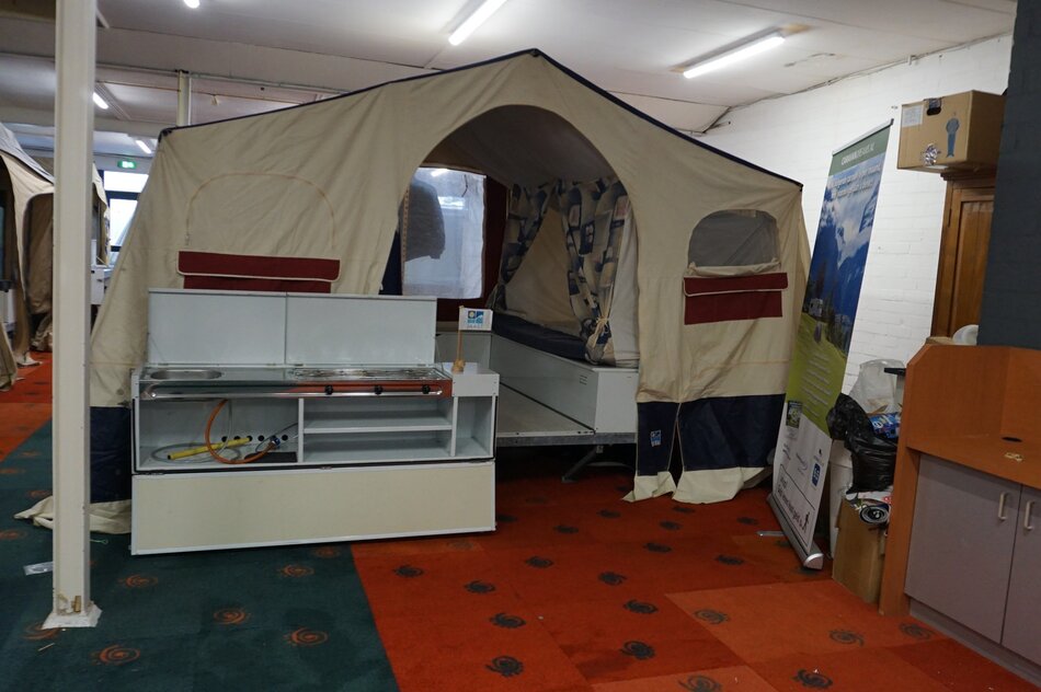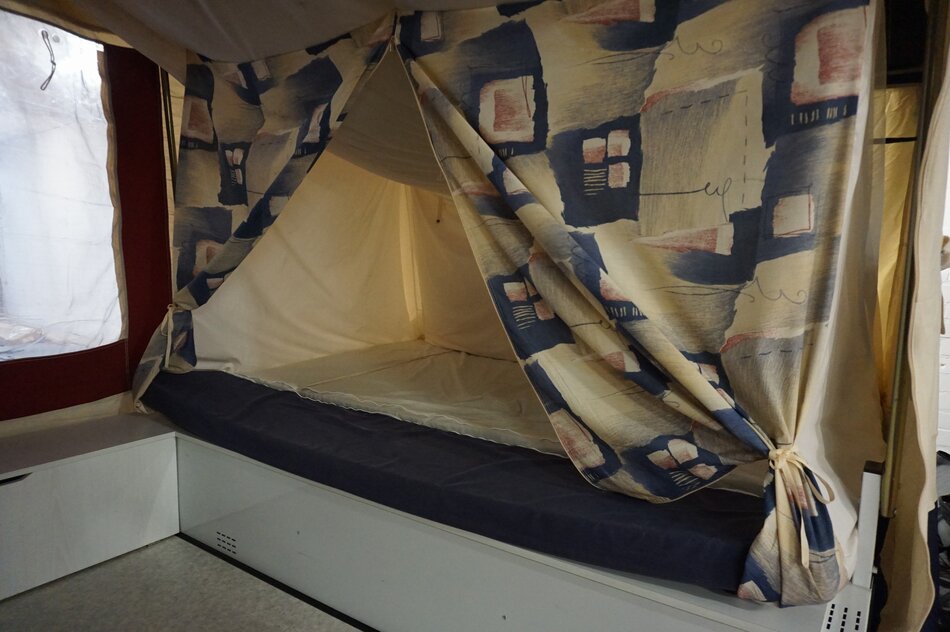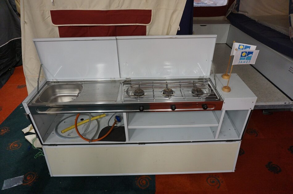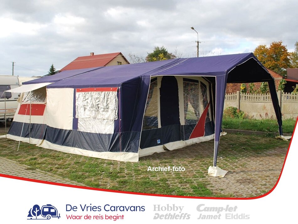 Uitstekend onderhouden Jamet Arizona. Eenvoudig op te zetten wagentent. Slapen op comfortabele lattenbodems. Ruime voortent met keukenuitbouw 485x320. Luxe keuken. Luifel.