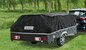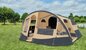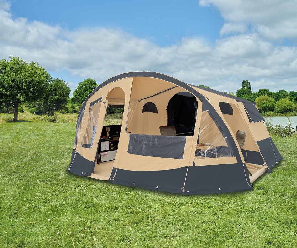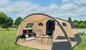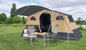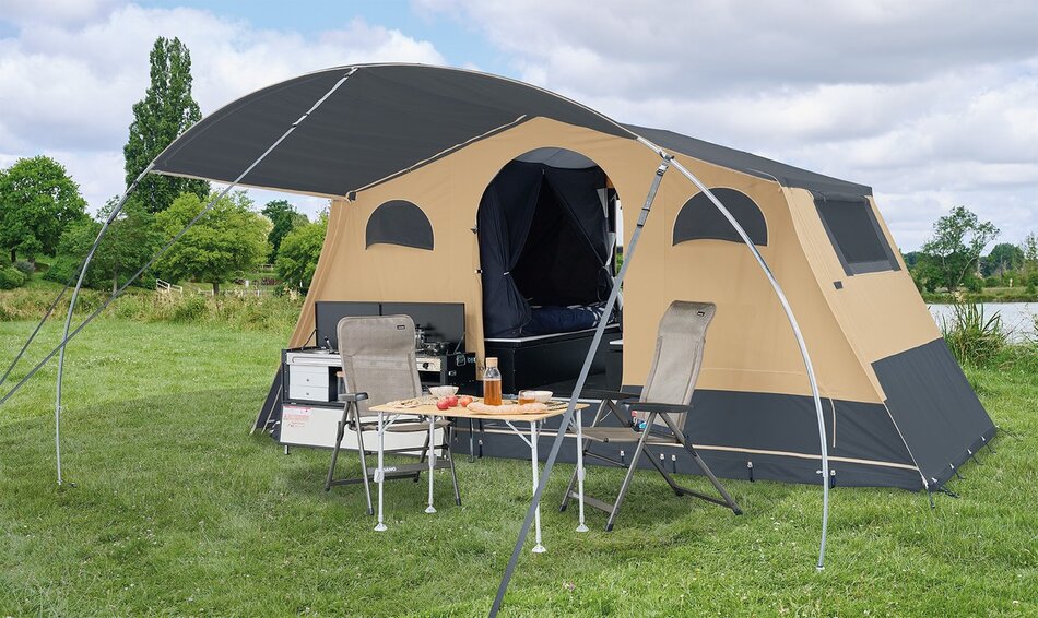 Jamet Dakota Outdoor in de nieuwe kleuren beige en een zwarte wagen. Ruime boogvoortent met inrits grondzeil. Wordt geleverd inclusief luifel en gratis grote disselbak.