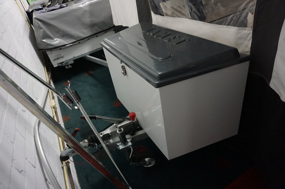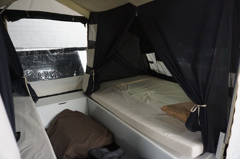 In zeer goede staat. Eenvoudig op te zetten boogtent met luifel en zijwanden. Ingeritst grondzeil. Grote disselbak. Imperial. Keuken kastje.